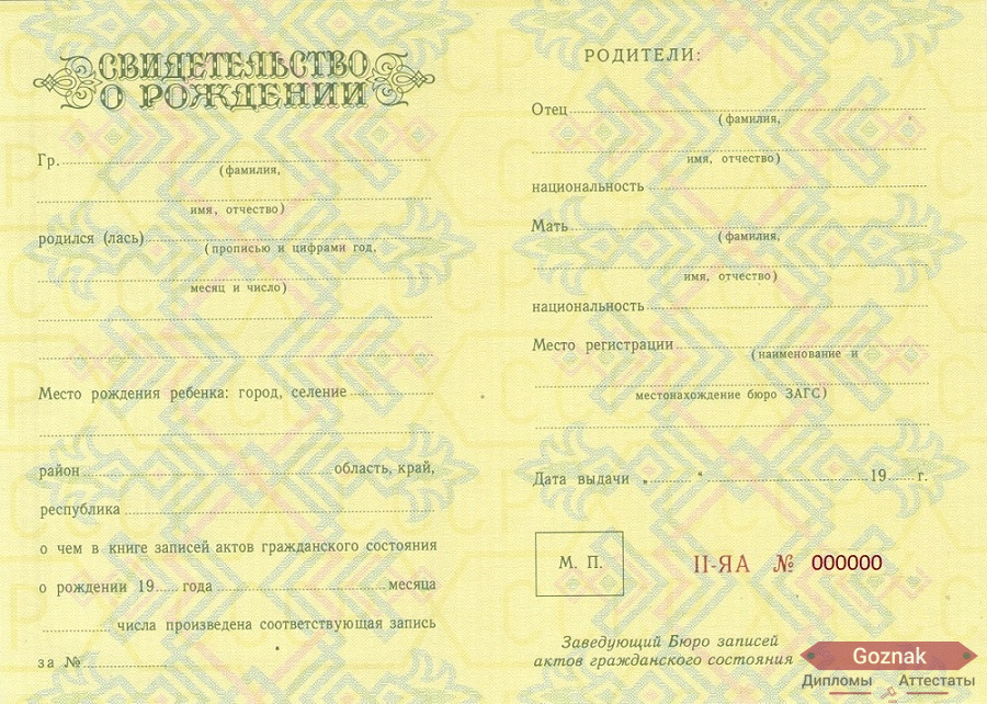 Компания «Гознак-Дипломы» успешно работает на рынке более 15 лет и предлагает Вам купить свидетельство о рождении СССР 1954 - 1970 гг. выгодно по хорошим ценам на настоящем бланке Гознак с оригинальными печатями и подлинными подписями. Документы имеют все степени защиты, оформлены по государственным нормам и с учетом особенностей конкретных учебных заведений. Свидетельства о рождении СССР 1954 - 1970 гг. на 100% соответствуют подлинникам, поэтому проблем точно не доставят, которые без опаски можно предоставлять в отдел кадров: