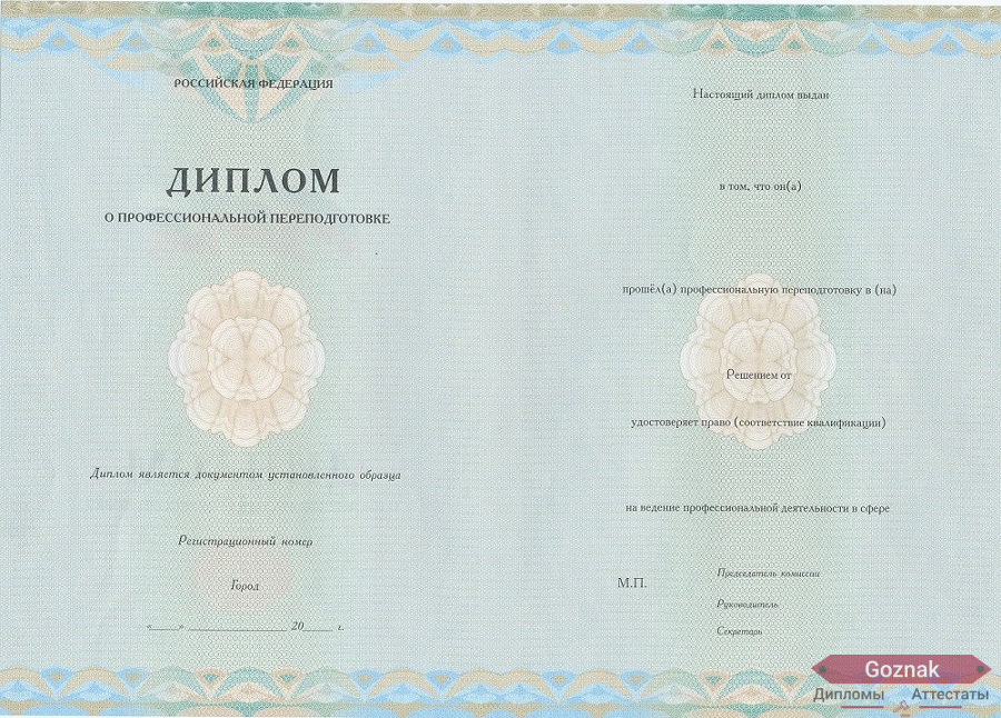 Компания «Гознак-Дипломы» успешно работает на рынке более 15 лет и предлагает Вам купить диплом о профессиональной переподготовке 2013 - 2015 гг. выгодно по хорошим ценам на настоящем бланке Гознак с оригинальными печатями и подлинными подписями. Документы имеют все степени защиты, оформлены по государственным нормам и с учетом особенностей конкретных учебных заведений. Диплом о профессиональной переподготовке 2013 - 2015 гг. на 100% соответствуют подлинникам, поэтому проблем точно не доставят, которые без опаски можно предоставлять в отдел кадров:
