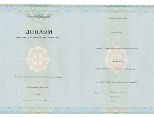 Диплом о профессиональной переподготовке 2013 - 2015 гг. заполняется профессиональными специалистами по установленным правилам и нормам министерства образования РФ. Документ на 100% соответствует всем требованиями Министерства Образования и Науки РФ.