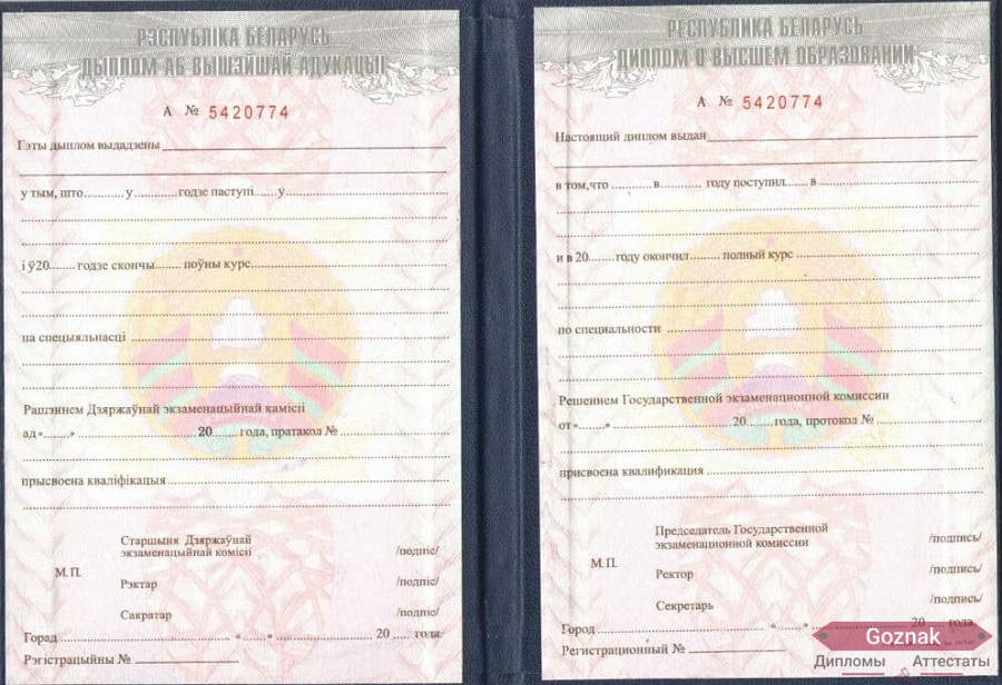 Компания «Гознак-Дипломы» успешно работает на рынке более 15 лет и предлагает Вам купить диплом о высшем образовании Белоруссии 1994 - 2010 гг. выгодно по хорошим ценам на настоящем бланке Гознак с оригинальными печатями и подлинными подписями. Документы имеют все степени защиты, оформлены по государственным нормам и с учетом особенностей конкретных учебных заведений. Диплом о высшем образовании Белоруссии 1994 - 2010 гг. на 100% соответствуют подлинникам, поэтому проблем точно не доставят, которые без опаски можно предоставлять в отдел кадров: