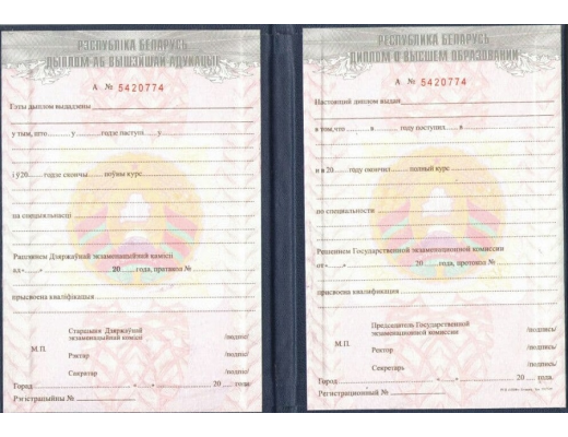 Диплом о высшем образовании Белоруссии 1994 - 2010 гг. заполняется профессиональными специалистами по установленным правилам и нормам министерства образования РФ. Документ на 100% соответствует всем требованиями Министерства Образования и Науки РФ.