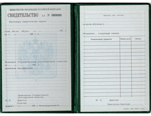 Свидетельство о повышении квалификации СССР до 1995 гг. заполняется профессиональными специалистами по установленным правилам и нормам министерства образования РФ. Документ на 100% соответствует всем требованиями Министерства Образования и Науки РФ.